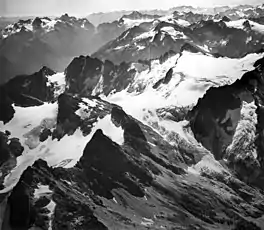 Colonial Glacier is in North Cascades National Park in the U.S. state of Washington and is immediately northwest of Neve Peak. Colonial Glacier flows generally north, descending from 6,800 to 6,000 ft (2,100 to 1,800 m).[2] Between 1950 and 2006, Colonial Glacier is estimated to have retreated more than 300 m (980 ft) and a newly formed proglacial lake filled the recently vacated former terminal moraine. The reduction in size of the glaciers of the North Cascades will reduce summertime meltwater runoff which is used to maintain a steady supply of electricity from hydroelectric power plants.[3]