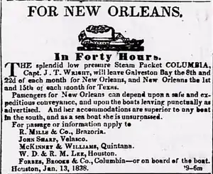 ![]() Advertisement for the steamboat Columbia, 10 February 1838 (Via the Portal to Texas History) | |