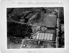 Presently, a larger site was desired, and so a new club was incorporated on August 25, 1909, with 200 of the Columbia Golf Club's 600 members.[5] This new Columbia Country Club purchased its present site on Connecticut Avenue that year from the Chevy Chase Land Company, which offered favorable terms to the club in hopes of attracting home buyers to its nearby developments.[6] The 126-acre (51 ha) site consisted of two parcels of forest and farmland separated by a 100-foot-wide right-of-way held by the Baltimore & Ohio railroad. The club built its golf course on both sides of the rail line; for more than a half-century, club members would cross the tracks to golf alongside trains hauled by steam[7] and then diesel[8] locomotives between the B&O's busy Metropolitan Branch and Georgetown's industrial waterfront.[9]