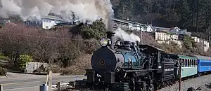 On March 2, 2019, Skookum made its official first public run, and several years restoration work on the engine was finally completed.[6] Some days later, the engine participated in two public photo charters that were sponsored by Trains Magazine, and McCloud 25 and Polson Logging 2 also took part.[12] In April No. 7 steamed to Tillamook, its last operation on Oregon soil;[13] the engine and tender were subsequently loaded into separate heavy-haul trucks and transported south to the Niles Canyon Railway.[13] After arriving in the NCRY's location in Sunol, California, No. 7 spent the entirety of the 2019 summer months pulling excursion trains on NCRY's trackage alongside their own locomotives.[14] In March 2020, at the onset of the COVID-19 pandemic, the NCRY closed to the public and No. 7 was left in storage.[15] In September 2020, the NCRY reopened to the public, with Skookum pulling several other excursions in the ensuing months, including a May 1, 2021 run to benefit the restoration of Southern Pacific 1744.[15][16] No. 7 currently remains at the NCRY’s location, but it is unknown whether it will remain there or be moved to another railroad location.