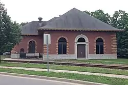 The two-color brick scheme provides accent around the windows and doors, highlighting the arches over the windows. The hip-roofed structure was originally covered with gray, clay tiles and had a number of ventilation stacks protruding high above the roof line.