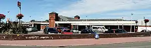 Colwyn Bay station was opened by the Chester and Holyhead Railway in October 1849; originally named Colwyn, it was renamed Colwyn Bay in 1876.[1] The station is in an unusual location straddling a curved section of track. As a result, the track bed is cambered so that trains come to rest at the station platform at a significant tilt. In recent years enforcement action was taken by the Environment Agency when fuel oil spilled from the over-filled tanks of a diesel engine and percolated through the track bed and flowed onto the nearby beach, polluting it.