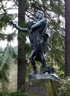 Coming of the White Man is a bronze sculpture designed by Hermon Atkins MacNeil (1866–1947), an American artist most known for depicting indigenous peoples of the Americas and Western pioneers. The statue is installed in Portland's Washington Park, along Southwest Washington Way.[1] It depicts Chief Multnomah and another Native American man looking towards the Columbia River upon the arrival of Lewis and Clark.[1] One man is shown holding branches in his lifted right arm, pointed in the direction of the approaching explorers; the other figure folds his arms in front.[2]