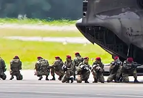 Commandos is the special forces formation of the Singapore Army responsible for conducting special operations. Commandos are tasked with infiltrating behind enemy lines by raiding and reconnaissance operations using airborne raids, helicopter assault and sea landings. The formation is made up of only one battalion, the 1st Commando Battalion (1 CDO BN),[3] and is based in Hendon Camp.[1]