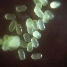 Seeds are ovoid; 2 mm long and 1.5 mm wide. There are four types of seeds - large and small aerial and underground. Plants from large underground seeds grow fastest in the first 2–4 weeks and so seem to have better competitive ability. All the other types of seeds have a dormancy period. They may be produced to survive stressful periods (e.g. droughts) or to spread to new areas. Kim Sang Yeol found that most (75-77%) seeds were of the small aerial type, and that only 2-4% of seeds were underground seeds.[18]