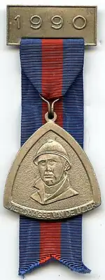 The medal is round or triangular, made in silver or bronze, and showing the imprint of a World War I Belgian soldier, but the shape of the medal can change every five years. The ribbon is dark blue with a large vertical scarlet stripe. Small metal bars are added to the ribbon when the bearer has completed the march more than one time.