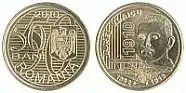 | 50 bani | 23.75 mm | 6.1 g | brass | "ROMANIA* ROMANIA*" |