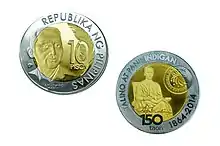 In 2018 and 2019, the Bangko Sentral ng Pilipinas issued commemorative coins in commemoration of the anniversary of the Bangko Sentral ng Pilipinas, two 500-peso silver coins, with one commemorating the 25th anniversary of the formation of the current Bangko Sentral ng Pilipinas[8] and one commemorating 70 Years of Central Banking in the Philippines (in reference to the formal establishment of the original Central Bank of the Philippines/Bangko Sentral ng Pilipinas in 1949).[9] A 10,000 peso gold coin was also issued to commemorate 70 years of Central Banking in the Philippines.[10]