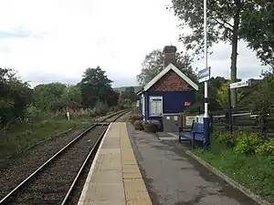 The single platform, on the northern side of the line, has a single brick building, in the same style as other buildings in the hamlet, as opposed to stone built buildings at most other places on the line.[2][10]