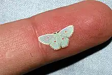The wingspan is about 20 mm. Adults are green with several red dots on each wing.