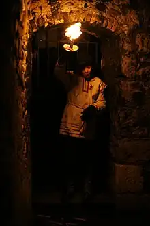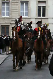 On Sunday evening, lit by torchbearers creating a special atmosphere, the parade into the town attracts tens of thousands of people.[9] Bringing in good order all costumed compagnons, horses, carriages and weapons, the parade explores the old city, the lower streets, and the Saint-Gervais area during more than 3 hours.[10] Along the way, the parade stops in five emblematic places of the city (Bourg-de-Four, Molard, Coutance, Corraterie, Cour Saint-Pierre), places where the herald - horseman dressed in the colors of Geneva - delivers proclamation - an oration recalling the history of the Escalade to the people gathered. The last step in the forecourt of the Geneva's Cathedral Saint-Pierre traditionally ends with a bonfire. With this procession, the Escalade could be the largest free historical reconstitution in Europe. The next weekend of celebration and remembrance will take place on December 11, 12 and 13th, 2015.