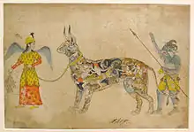 There are several mythical creatures in India and Persia where imagery of animals and humans are fused, including Yali in Hinduism and the Buraq in Persia.[1] A similar concept is seen in several miniature paintings, mainly from Mughal and Deccan traditions. Other examples are found in Rajput, Murshidabad, and Delhi schools.[2] Most examples show figures made from several human figures and various animals.[1]