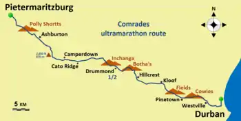 The race is run on the roads of KwaZulu-Natal province, marked by "The Big Five" set of hills. On the up run they appear in the following order: Cowies Hill, Fields Hill, Botha's Hill, Inchanga, and Polly Shortts. The highest point of the race, at 2,850 feet (870 m) above sea level, is situated near the Umlaas Road interchange. Approximately 40 official refreshment stations along the route are stocked with soft drinks, water sachets, energy drink sachets, fruit, biscuits, energy bars, cooked potatoes and other refreshments.[10] About eight physiotherapy and first aid stations are also located at strategic points.[11]