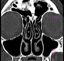 A concha bullosa is a pneumatized (air-filled) cavity within a nasal concha, also known as a turbinate.[1] Bullosa refers to the air-filled cavity within the turbinate.[1] It is a normal anatomic variant seen in up to half the population. Occasionally, a large concha bullosa may cause it to bulge sufficiently to obstruct the opening of an adjacent sinus, possibly leading to recurrent sinusitis[1] and various head pains related to areas innervated by the trigeminal nerve.[2] In such a case the turbinate can be reduced in size by endoscopic nasal surgery (turbinectomy). The presence of a concha bullosa is often associated with deviation of the nasal septum toward the opposite side of the nasal cavity.[3]
