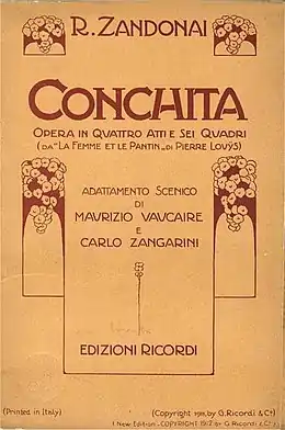 Conchita is an opera in four acts and six scenes by composer Riccardo Zandonai. The work uses an Italian language libretto by Maurizio Vaucaire and Carlo Zangarini which is based on Pierre Louÿs's 1898 novel La Femme et le pantin. The work premièred in Milan at the Teatro dal Verme on 14 October 1911 with soprano Tarquinia Tarquini, who later married Zandonai in 1917, in the title role.[1] Her portrayal was lauded by critics and she went on to perform Conchita at the Royal Opera, London (1912), the Cort Theatre in San Francisco (1912), the Philharmonic Auditorium in Hollywood (1912), the Heilig Theatre in Portland (1912), the Metropolitan Opera House in Philadelphia (1912), the Chicago Grand Opera Company (1913), and the Teatro di San Carlo in Naples (1913).[2] The opera was published by G. Ricordi & Co in 1912.