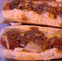 Main ingredientsHot dog, or a beef or beef and pork European-style Vienna sausage with lamb or sheep casing, topped with a meat sauce made of seasoned ground beef or beef heart, topped with yellow mustard, white onion and sometimes cheese.