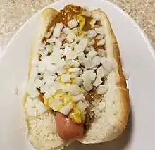 Jackson style uses a topping of either ground beef or ground beef heart, onions and spices. This meat sauce is applied on a quality hot dog in a steamed bun and then topped with diced or chopped onions and a stripe of mustard. The Todoroffs' restaurants were some of the earlier locations for Jackson coneys beginning in 1914. However, those locations are now closed. The company currently manufactures and distribute their coney sauce for retail purchase at supermarkets or other restaurants.[32] There are several other coney restaurants in the area, most notably Jackson Coney Island, Junk Yard Dog, and Virginia Coney Island, all of which are located on East Michigan Avenue in front of the train station near where the original Todoroff's restaurant was located. These restaurants all use a blend of onion and spices similar to Todoroff's but use ground beef heart instead of ground beef for the coney sauce. The Jackson style was late to the usage of beef heart in the sauce, using ground beef prior to converting to ground beef heart in the early 1940s.[33] Each year Jackson Magazine or the Jackson Citizen Patriot have a best coney contest voted on by residents for all the restaurants in the area.[34][35]
