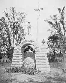 The monument was erected in 1902 and commemorates the 2,260 Confederate soldiers buried at the site.[5][6] The memorial is 17 feet (5.2 m) and includes a bronze figure of a soldier standing on a granite arch, holding a rifle. Its original wooden arch, which was inscribed with the word "AMERICANS", was replaced with the current stone arch in 1902.[7]