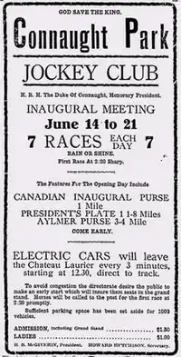 The track was founded in 1913, named after the governor-general of the time Prince Arthur, Duke of Connaught and Strathearn, who was also the club's first honorary president. The Connaught Park Jockey Club was founded by J. McEntee Bowman, a hotelier from New York city, Ed Skead and J. K. Paisley. The first president was Hal B. McGiverin. Directors included Thomas Ahearn, J. W. Woods, L. N. Bate, Redmond Quain, Stewart McClenahan, J. W. Carling, N. A. Belcourt, C. E. Fauqier and Clifford Sifton. The 90 acres (36 ha) site was selected from several sites in Aylmer and special soil was brought to the site and a one-mile track was laid out. At first, the race track held thoroughbred racing, but steeplechase races were also held, through the field at the track.[1]