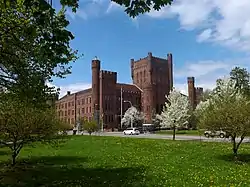 Connecticut Street Armory, also known as the 74th Regimental Armory, is a historic National Guard armory building located at Buffalo in Erie County, New York. It is sited at Columbus Park. It is a massive castle-like structure built in 1899 of Medina sandstone. It was designed by architect Isaac G. Perry. It consists of a 3+1⁄2-story administration building with an attached 2-story drill shed all constructed of sandstone, lying on a rusticated battered stone foundation. The building features 4- to 6-story towers surrounding the administration building, and a 6+1⁄2-story square tower at the center entrance. It is home to the 74th Regiment of the New York National Guard.[2] Prior to its construction, the site was home to a 13.5 million gallon reservoir.[3][4]
