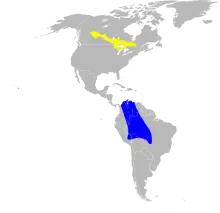 As mentioned earlier, the Connecticut warbler is an elusive species. Little is known about it outside of the breeding season as to this date, less than 25,000 individuals have been banded.[11] These birds migrate to the Amazon Basin in South America in winter. Specimens have been observed in Colombia (north & southeast), Venezuela (northeast & interior), Guyana (at the border), and Peru (South).[11] Connecticut warblers undertake different migratory routes in spring and in fall, an atypical behavior. In spring, they normally pass through the Midwest and only rarely migrate to the East Coast, but in fall, larger numbers of migrating birds move through the East Coast. Recently, the use of small tracking devices has enabled scientists to gather more data on the warbler's migration routes. They have discovered some individuals fly over open water like the Blackpoll warbler. More specifically, they recorded a previously undocumented two-day flight over the Caribbean to the Antilles.[11] This correlates with sightings of Connecticut warblers that have occurred in Bermuda, St. Thomas and St Martin. Haiti on the island of Hispaniola is also a popular stop, but records there are hard to find due to the terrain being rather remote and past humanitarian crises; it is also additionally threatened by the ongoing deforestation in both Haiti and the Dominican Republic.[11] There, they make a minimum of 48-hour stop (it usually lasts 5–7 days) in the Caribbean. This long migration over open water calls for strong selective pressures. A comparative study between the Connecticut warbler and the blackpoll warbler could help determine what selective pressures are present in these two species. This kind of migration also demands large reserves of fuel and this is why fat Connecticut warblers can be found on the East Coast in early fall.[11] It's also the reason why they make several stopovers on their way South.