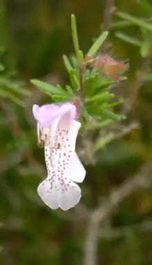 This aromatic shrub generally grows up to about 1.5 meters in maximum height, but it is known to reach two meters. The branches end in twigs which are coated in pale hairs. The hairy, glandular, needle-like leaves are up to 1.5 centimeters in length. Each flower has a hairy, maroon-tinged calyx of pointed sepals. The flower corolla is about 2 centimeters long, with a funnel-shaped throat and a hairy, lipped mouth. It is lavender in color with darker lavender spots. This species has the largest flowers of the genus Conradina.[1] The plant flowers year-round.[2]