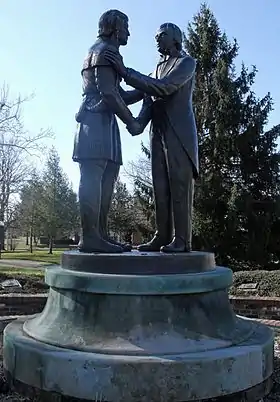 In the 1970s, Centre College president Thomas A. Spragens began a series of urban renewal projects in Danville using grants from the U.S. Department of Housing and Urban Development.[11] One such project was the expansion of Constitution Square and the restoration of some of its key features.[11] Part of First Street was closed to accommodate the expansion, and the African-American business district, which lay on Constitution Square facing the Ephraim McDowell House, was razed.[10][11] Grayson's Tavern, Fisher's row houses, the Goldsmith House, and the brick schoolhouse were renovated, and the Governor's Circle was added to the site.[11] A bronze statue depicting two men shaking hands, a symbol taken from the state seal, stands in the middle of the Governor's Circle.[11] Plaques that honor each governor of the state encircle the statue.[11] The entirety of the Governor's Circle honors Isaac Shelby, Kentucky's first and fifth governor.[10] Shelby is believed to be responsible for Kentucky's adoption of the motto "United we stand, divided we fall", which also appears on the state seal.[10] The landscaping around the circle is maintained by the Garden Club of Danville.[12]