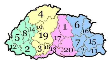 The Constitution defines the Kingdom of Bhutan as a democratic constitutional monarchy belonging to the people of the Kingdom. The territory of Bhutan is divided into 20 Dzongkhags (Districts) with each consisting of Gewogs (Counties) and Thromdes (Municipalities). Dzongkha is the national language of Bhutan,[8] and the National Day of Bhutan is December 17.[9]