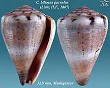 - Conus biliosus parvulus Link, 1807 (synonyms: Conus parvulus Link, 1807; Conus imperator Woolacott, 1956; Conus roseus Lamarck, 1810)