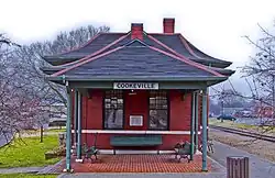 The Nashville & Knoxville Railroad constructed the first railroad depot at Cookeville in the 1890s. The mere announcement of the company's plans for the depot "one half-mile west of the courthouse" caused property values in the western section of town to skyrocket. Along with the depot, N&K built a two-story office building, a reservoir, and several repair shops. The Tennessee Central replaced the N&K depot with the present pagoda-like structure in 1909, although it moved the service facilities to Monterey.[1]