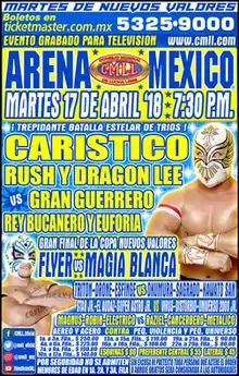 In 1996 CMLL introduced La Copa Junior, a tournament for second or third-generation wrestlers, often lower ranked, again to showcase at least one of the competitors in the tournament.[3] The La Copa Junior has been held intermittently since 1996 although not on an annual schedule. In 2014 CMLL held both a regular version of La Copa Junior, and a "VIP" version focusing more on well established second-generation wrestlers, distinguishing itself from the tournament that focuses on younger wrestlers.[4][5] In 2011 CMLL held the Forjando un Ídolo ("Forging an Idol") tournament, featuring 16 low-to-mid card wrestlers competing in the tournament. The tournament was won by Ángel de Oro and signaled his ascent up the ranks of CMLL.[6] In both 2012 and 2013 CMLL held the Torneo Sangre Nueva (literally "the New Blood Tournament"), featuring younger, lower ranked wrestlers in the traditional tournament format. In early 2018 CMLL decided to hold a new tournament focusing on their lower ranked or younger competitors called the Torneo Nuevos Valores ("New Values Cup") featuring 16 competitors who had yet to get many opportunities in CMLL, in a three-week long tournament.[7] Audaz and Templario were originally announced for the tournament,[7] but were replaced by Astral and Príncipe Odin Jr. later on without any explanation.[8][9]