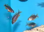 C. borleyi is a relatively small cichlid, males grow to 13-16 centimetres (5–6 in) total length, while females are typically slightly smaller reaching 13 centimetres.[4][5][6][7] In addition to these minor difference in size, the species displays marked sexual dimorphism with males displaying larger ventral fins marked with egg spots, light-blue edging to the dorsal and ventral fins, along with metallic blue colouration of the head, and yellow to red flanks. In contrast, females are silver-to-brown and display three black spots along their sides.[4] Juveniles are monomorphic and are coloured like the adult females.[7] Some intraspecific variation has been recorded with regard to colouration, these differently coloured forms are geographically restricted to certain localities in Lake Malawi.[7]