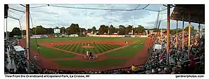 Copeland Park, also referred to as "The Lumber Yard", is a stadium in La Crosse, Wisconsin, USA. It is primarily used for baseball and is the home field of the La Crosse Loggers baseball team. The current stadium was built in 2003, although a substantially smaller baseball diamond existed at the site before the construction of the new ballpark. At the time of its construction, the stadium held approximately 2,000 people.[1] However, the success of the Loggers prompted expansions to the grandstand, bringing the capacity to its current 3,550 people.[2] The field dimensions are 325 ft. to left field, 365 ft. to center, and 315 ft. to right.