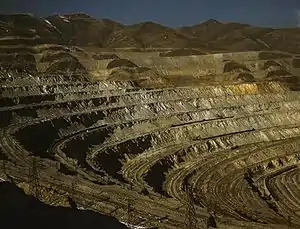 The Bingham Canyon Mine southwest of Salt Lake City has been one of the world's largest copper producers for more than 100 years. The mine, owned and operated by Kennecott Utah Copper (a division of Rio Tinto Group), is a large open pit in a porphyry copper deposit. (The Bingham Canyon Mine and the Chuquicamata copper mine in Chile each claim to be the largest open-pit mine in the world.) It continues to be a major source not only of copper, but also of molybdenum, gold, and silver. The value of metals produced in the year 2006 alone was $1.8 billion.[57]