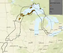 Native Americans mined copper from small pits on the Keweenaw Peninsula of northern Michigan as early as 3000 BC.[31] In the American era, the first successful copper mine, the Cliff mine, began operations in 1845, and many others quickly followed. The last major copper mine in Michigan, the White Pine mine, shut down in 1995, after unsuccessfully applying for a permit to convert the underground mine to an in-situ leaching operation.