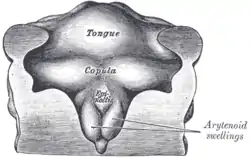 The copula linguae or copula, is a swelling that forms from the second pharyngeal arch, late in the fourth week of embryogenesis.[1] During the fifth and sixth weeks the copula becomes overgrown and covered by the hypopharyngeal eminence which forms mostly from the third pharyngeal arch and in part from the fourth pharyngeal arch.[1]