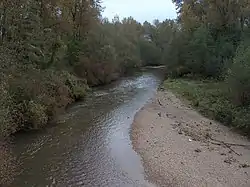 The Coquitlam River spans a total of 18 km from the dam to its outlet and receives sediment and water from 30 tributaries.[7][6] It is a meandering river with various features such as large boulders, riffles, undercut banks, sidebars, islands, oxbow lakes, large woody debris and small woody debris.[7] The sediment that is carried in the river is composed of glacial sands, gravel, clays, silts and some boulders.[7] The primary source of this sediment is Or Creek which supplies large amounts of cobbles, sand and silts.[6][7] The Coquitlam River is also located in a coastal western hemlock biogeoclimatic zone.[7][15]