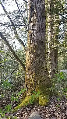 The Coquitlam River is a part of the Fraser Lowland ecosection and Coastal Western Hemlock biogeoclimatic zone. The undeveloped land surrounding the river includes an oxbow lake, wetlands, and side channels.[10][17] This riparian habitat includes a variety of vegetation from evergreens such as western red cedars to deciduous black cottonwoods. This forested area provides cover for animals such as black-tailed deer and racoons within the urban landscape in the lower reaches of the river.[10][18] The river and its tributaries are home to 24 different species of fish, 5 of these salmonids.[7][9] These salmon are a critical part of this ecosystem, providing a source of food for species such as black bears and bald eagles.[19] After spawning, the fish carcasses decompose on banks and release nutrients in the soil for vegetation such as salmonberries.[20]