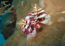 The sea hosts numerous species of anemones, sponges, worms (e.g. Spirobranchus giganteus shown in the photograph), gastropods, lobsters, crayfish, prawns and crabs. Red algae Lithothamnion and Porolithon colour many coral reefs purple-red and the green alga Halimeda is found throughout the sea. The coastal plants consisting of only about 30–40 species, and mangroves occur in the northern part of the sea.[11] Four hundred coral species, both hard corals and soft corals inhabit the reefs.[30] The majority of these spawn gametes, breeding in mass spawning events that are triggered by the rising sea temperatures of spring and summer, the lunar cycle, and the diurnal cycle. Reefs in the inner GBR spawn during the week after the full moon in October, while the outer reefs spawn in November and December.[31] Its common soft corals belong to 36 genera.[32] There are more than 1500 fish species in the reef systems.[33] Five hundred species of marine algae or seaweed live on the reef,[30] including thirteen species of the genus Halimeda, which deposit calcareous mounds up to 100 metres (110 yd) wide, creating mini-ecosystems on their surface which have been compared to rainforest cover.[34]