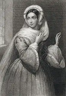 Cornélie Falcon (28 January 1814 [n 1] – 25 February 1897) was a French dramatic soprano who sang at the Opéra in Paris. Her greatest success was creating the role of Valentine in Meyerbeer's Les Huguenots. She possessed "a full, resonant voice"[4] with a distinctive dark timbre[5] and was an exceptional actress.[4] Based on the roles written for her voice her vocal range spanned from low A-flat to high D, 2.5 octaves. She and the tenor Adolphe Nourrit are credited with being primarily responsible for raising artistic standards at the Opéra,[4] and the roles in which she excelled came to be known as "falcon soprano" parts.[6] She had an exceptionally short career, essentially ending about five years after her debut, when at the age of 23 she lost her voice during a performance of Niedermeyer's Stradella.