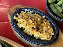 Sweet corn kernels are sautéed with butter on a skillet, optionally with vegetables such as onions or bell peppers that are diced to be of similar size to the corn kernels. If vegetables are used, they should be lightly salted and have their excess moisture removed. Mayonnaise and optionally sugar is mixed in, and mozzarella cheese (often shredded) is added over the sautéed corn mixture. It is then broiled in an oven until the cheese browns. In restaurant settings, it is often served sizzling in a hot dish.[2][3]