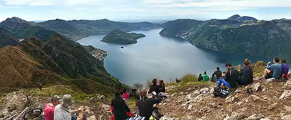 Corna Trentapassi is a mountain of the Brescia Pre-Alps in Italy. It is 1248m high, located on the eastern shore of Lake Iseo. It marks the beginning of Val Camonica. It is made up of limestone rocks which give it a harsh and steep aspect. Vegetation cover is scarce, especially on the barren southern slope.