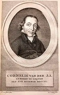 Cornelis van der Aa (Leiden, 22 October 1749 – Amsterdam, 1816) was a bookseller in Haarlem when he was sentenced in 1796 by the schepenen of the city to five years of imprisonment and consecutive perpetual exile from the department in Holland for political reasons as he was a follower of the stadtholders. At the end of 1799, he was released and settled in Utrecht as a bookseller. From then on until his death in 1816 in Amsterdam, where he moved to later on, he spent his time writing books.