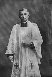 Having for years served as an organist and interpreter for Episcopal services by the Rev. Goodnough and his successors, as well as his tribe's sachem and delegate to church councils, Hill thought ordination would bring additional authority among whites as well as help him become a bridge between the cultures. Since 1870 (perhaps in Thanksgiving for having been relatively spared from horrendous forest fires that devastated Wisconsin), church members had volunteered at a limestone quarry one day a week, in order to dress stone for a new church building. In 1886 they laid the cornerstone for a new gothic stone chapel, which they named the Church of the Holy Apostles, to replace an overly small and somewhat decrepit wood chapel. On June 27, 1895, Bishop Charles C. Grafton ordained Hill a deacon. However, the event was bittersweet as Hill's infant son had died in an epidemic and was scheduled for burial that very afternoon.[7] Furthermore, his ally the Rev. Burleson died in February 1897, months before the new church's formal consecration, and Burleson's popular youngest son (all five of whom had become priests) was transferred to Texas the following year. On June 24, 1903, Bishop Grafton ordained Hill as a priest, the first of his people; during the ceremony Hill repeated his vows in his native language.[8] The Wisconsin reservation also had a Methodist mission with a dedicated missionary and a Catholic chapel served by a priest from De Pere, about ten miles away.[9]
