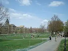An important factor in the amount of the open space on the central campus was the gift in 1902 of the alumni fields, which the Alumni leveled to provide athletic playing areas in exchange for a promise that it would remain forever open for that purpose. In 1910, the expansion of the Ag School south of Tower Road caused the Trustees and the Alumni Field Committee to agree to exchange the east end of the fields (the site of Stocking Hall) for the area which now includes Schoellkopf Field and Hoy Field.[48]