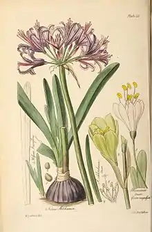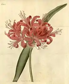 Herbert's main role was in untangling a number of distinct genera that Linnaeus had included under Amaryllis.[20][2] Although in Herbert's description of Nerine rosea there, he attempted to distinguish it from N. sarniensis, the former is now accepted as a synonym of the latter, the accepted name.[21] When Herbert chose the name of these nymphs for the first species of the genus, Nerine sarniensis, he alluded to the story of how this South African species arrived on the island of Guernsey in the English Channel. It is said that a ship carrying boxes of the bulbs of this species destined for the Netherlands was shipwrecked on Guernsey. The boxes of bulbs were washed up on the island and the bulbs became established and multiplied around the coast.[22] Herbert eventually recognised nine species. At that time Amaryllis (and hence Nerine) were placed in the family Amaryllideae, following the classification of de Candolle (1813).[23] Herbert's main interests were in the taxonomy of amaryllids, publishing a monograph on this in 1837,[24] considering Amaryllideae as one of seven suborders of Amaryllidaceae. He then further subdivided this suborder into groups, placing Nerine and Amaryllis together with twelve other genera into the Amaryllidiformes.[25] In his extensive treatment of Nerine he divided the nine species he recognised into two sections, Regulares and Distortae, of which only N. humilis and N. undulata are still in use. He had also begun a breeding program and described seven hybrids he had raised.[26] His enthusiasm for the genus is evident in that he chose to illustrate the front of the book with one of his hybrids, N. mitchamiae (see illustration).[27]