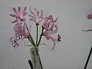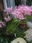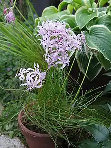 Nerine /nɪˈraɪniː/[4] (nerines, Guernsey lily, Jersey lily, spider lily) is a genus of flowering plants belonging to the family Amaryllidaceae, subfamily Amaryllidoideae. They are bulbous perennials, some evergreen, associated with rocky and arid habitats. They bear spherical umbels of lily-like flowers in shades from white through pink to crimson. In the case of deciduous species, the flowers may appear on naked stems before the leaves develop. Native to South Africa, there are about 20–30 species in the genus. Though described as lilies, they are not significantly related to the true lilies (Liliaceae), but more closely resemble their relatives, Amaryllis and Lycoris. The genus was established by the Revd. William Herbert in 1820.