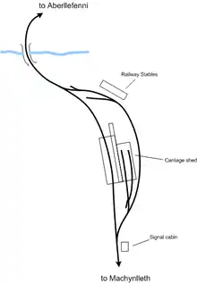 On 3 January 1863, the standard gauge Newtown and Machynlleth Railway had opened, followed on 1 July of the same year by the Aberystwith and Welsh Coast Railway's (A&WCR) line from Machynlleth to Borth. These two lines became part of the Cambrian Railways by August 1865. The opening of the standard gauge line to Borth made the section of the CM&RDT from Machynlleth to Morben obsolete. It was much easier to transship slates to the main line at Machynlleth, so the lower section of the tramway was abandoned.[6]