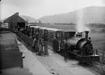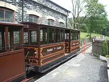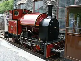 In December 1878 the first steam locomotive purchased from the Hughes Locomotive Company arrived.[10] By February 1879 it had been joined by the other two that had been ordered and all three had begun work. Although the carriages arrived in 1878 it was not until 1883 that the Act of Parliament was secured to allow the formal commencement of passenger services.[9] A semi-official passenger service had been running since the early 1870s using adapted waggons to convey quarry workers and visitors.