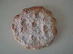 Several cakes are prepared for feasts and special occasions, and some are characteristic of one town or village: Strenna (a pie made with flour and sdruttu dough and a brocciu filling) is prepared in Vico for New Year's Day, panzarotti (beignets made with flour, rice and yeast) are prepared in Bastia for St. Joseph's day (19 March),[90] panette for All Saints' Day (1 November), pan di i morti (also named uga siccati, small breads made with flour, yeast, sugar, butter, eggs, raisins and walnuts) for All Souls' Day (2 November) in Bonifacio,[91] canestri (donuts made with flour, butter, eggs and sugar) [92] and campanili (donuts made with flour, yeast, egg, shortening, raisins soaked in aquavita and sugar, decorated with boiled eggs) [92] at Easter, sciacci (the sweet version of these fritters, stuffed with brocciu, and traditionally cooked on a hot granite stone named teghja) are prepared in Sartène at Easter and during sheep shearing, in May.[93] Inuliata, prepared in Ajaccio during the holy week, is a yeast cake having flour, powdered sugar, olive oil and wine as ingredients.[86] Fritelli, eaten at Maundy Thursday in Calenzana,[13] are wheat or chestnut flour fritters.[94]